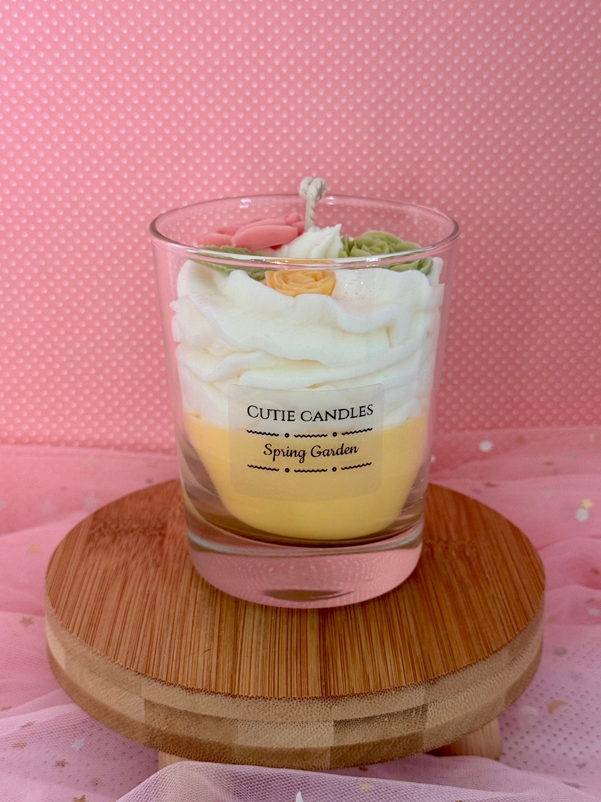 Verleihen Sie Ihrem Zuhause eine süße und stilvolle Note mit unserer exklusiven Dessertkerze aus natürlichem Sojawachs. Diese einzigartige Duftkerze präsentiert sich in der angesagten Trendfarbe Buttergelb (Butter Yellow), dem absoluten Farb-Highlight des Jahres für Fashion und Interior-Design. Liebevoll verziert mit kunstvollen, pastellfarbenen Rosen, ist diese Kerze ein optischer Genuss und verströmt gleichzeitig einen unwiderstehlichen Duft im ganzen Raum.